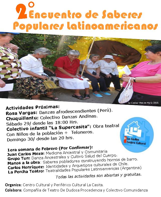 Estimad@s amigas y amigos del Periférico Cultural La Casita, tenemos el agrado de invitarlos al segundo encuentro de saberes populares latinoamericanos. Este nuevo esfuerzo se genera con el objetivo de allegarnos a los saberes recogidos cotidianamente de nuestra gran Pacha Latinoamericana: